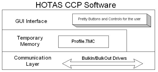 The HOTAS CCP (Cougar Control Panel) is a Windows software program that interfaces to the HOTAS Cougar. It controls and displays all the settings for the Cougar. The following diagram shows the basic structure of the software: