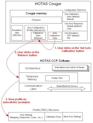 The auto calibration is performed continually, but is most sensitive whenever you flash the Cougar. At this point, the Cougar needs to have its axis moved to all the extremes so that it can calculate its values. It stores this data in its auto calibration data section of memory. If the user wants to retrieve this data and save it to a profile, the user needs to click on the 'Get Auto Calibrate' button in the 'Startup & Calibration' tab of the CCP. When the user clicks on this button, the following action happens: