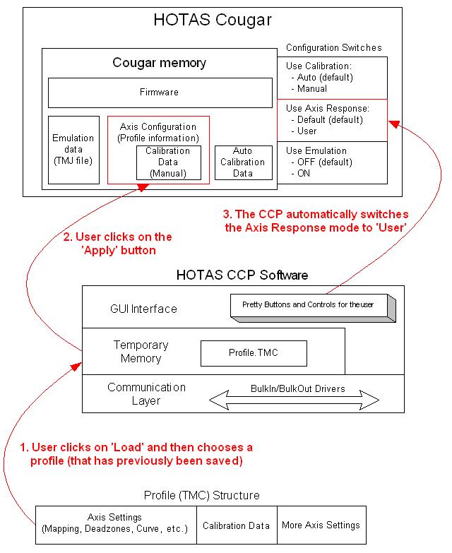 When the user clicks on the 'Apply' button, the CCP takes the information inside its temporary memory (whether it's been changed from the original loaded profile or not) and sends it to the Cougar. The Cougar stores this information in the 'Axis Configuration' part of its memory.