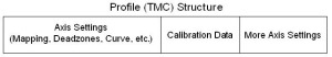 A profile is the axis configuration settings of the Cougar. It can either be in the form of memory inside the Cougar and the CCP or it can be a file that is saved on the user's hard driver. The structure of the profile is very basic. It contains information about the axis mapping, deadzones, curve, etc. and calibration data. The following diagram shows the profile structure: